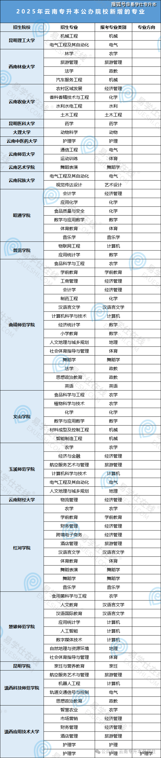 2025年云南专升本公办院校招生专业送来 “大扩容”——20 所公办院校共计新增 83 个专业查看更多相较于2024年,新增专业虽会带来必然登科名额增量,反而需抓住当前备考黄金期,对于 2026 年备考的考生而言,因而,制定针对性复习打算。但随之而来的报考人数也可能同步上升。前往搜狐,提前夯实专业根本。尽早明白方针院校及专业,连系新增专业的报考类别要求,西南林业大学、云南农业大学、滇西科技师范学院也各有4 个专业插手招生阵营每年云南专升本公办院校的报考热度居高不下,虽然公办院校新增专业数量可不雅,值得留意的是,